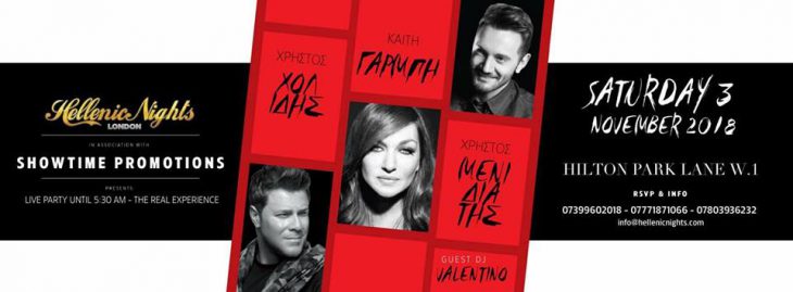 Hellenic Nights London and Show Time Promotions Present Kaiti Garbi, Christos Cholidis and Christos Menidiatis on Saturday 3rd November 2018 between 11pm to 5:30am!