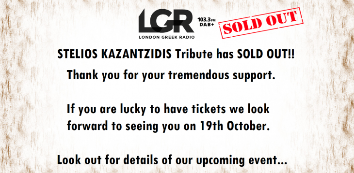 Tickets are £35 & £40. For more information call London Greek Radio on 020 8349 6950!