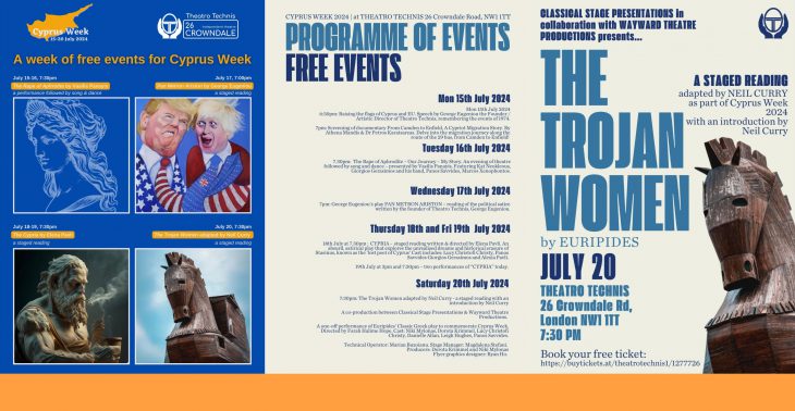 The Cyprus Week at Theatro Technis at 26 Crowndale, starts today. The 6-day free event which runs until 20th July, celebrates the talent and creativity of Cypriot and Greek artists.