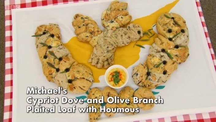 Michael gave us a Cypriot treat by way of ‘Michael’s Cypriot Dove and Olive Branch Plaited Loaf with Houmous’ in the bread challenge, and we even got to see a Cypriot flag! Really making the point he is definitely Cypriot and is proud of his roots.